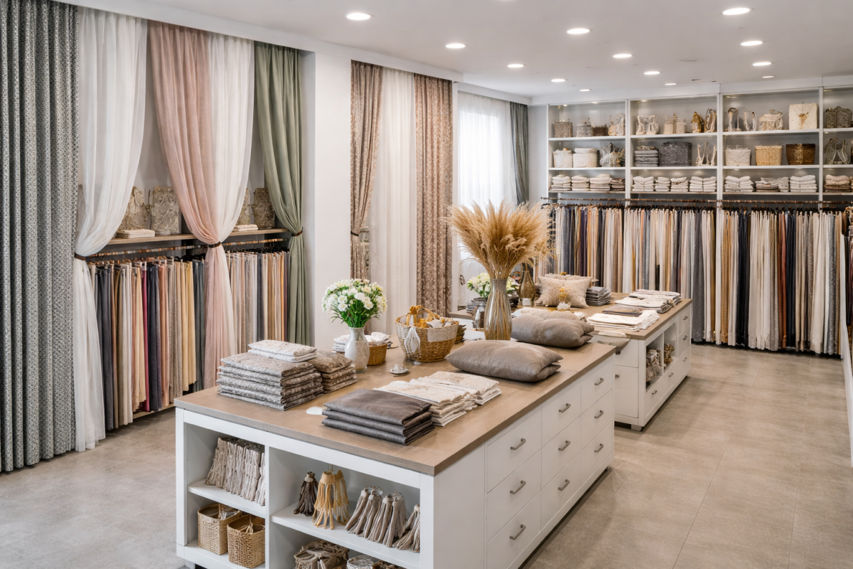 • Vasta Gamma di Tendaggi: Esposizione di tessuti per tende da interno, con diverse trame, colori e gradi di filtraggio della luce, dal classico al moderno.
